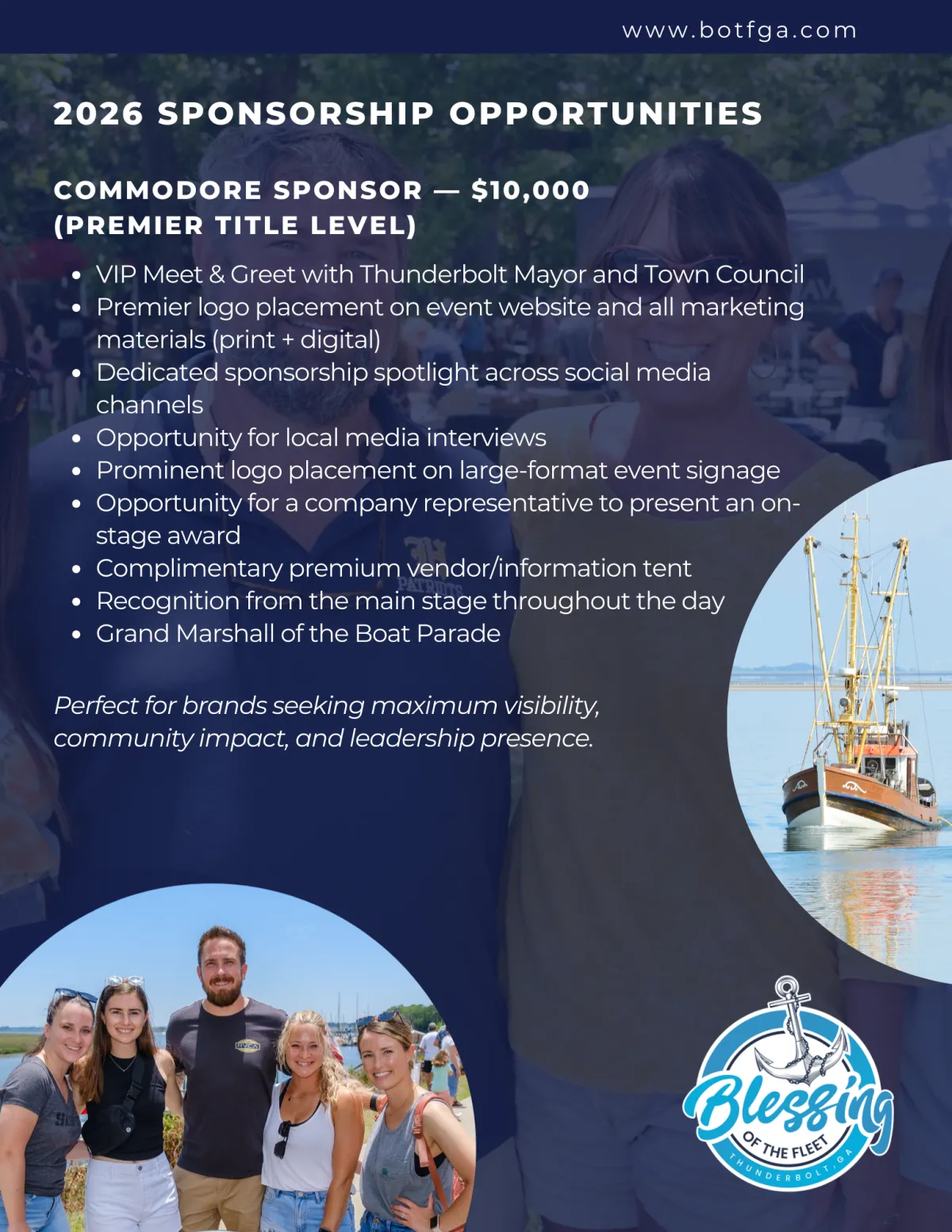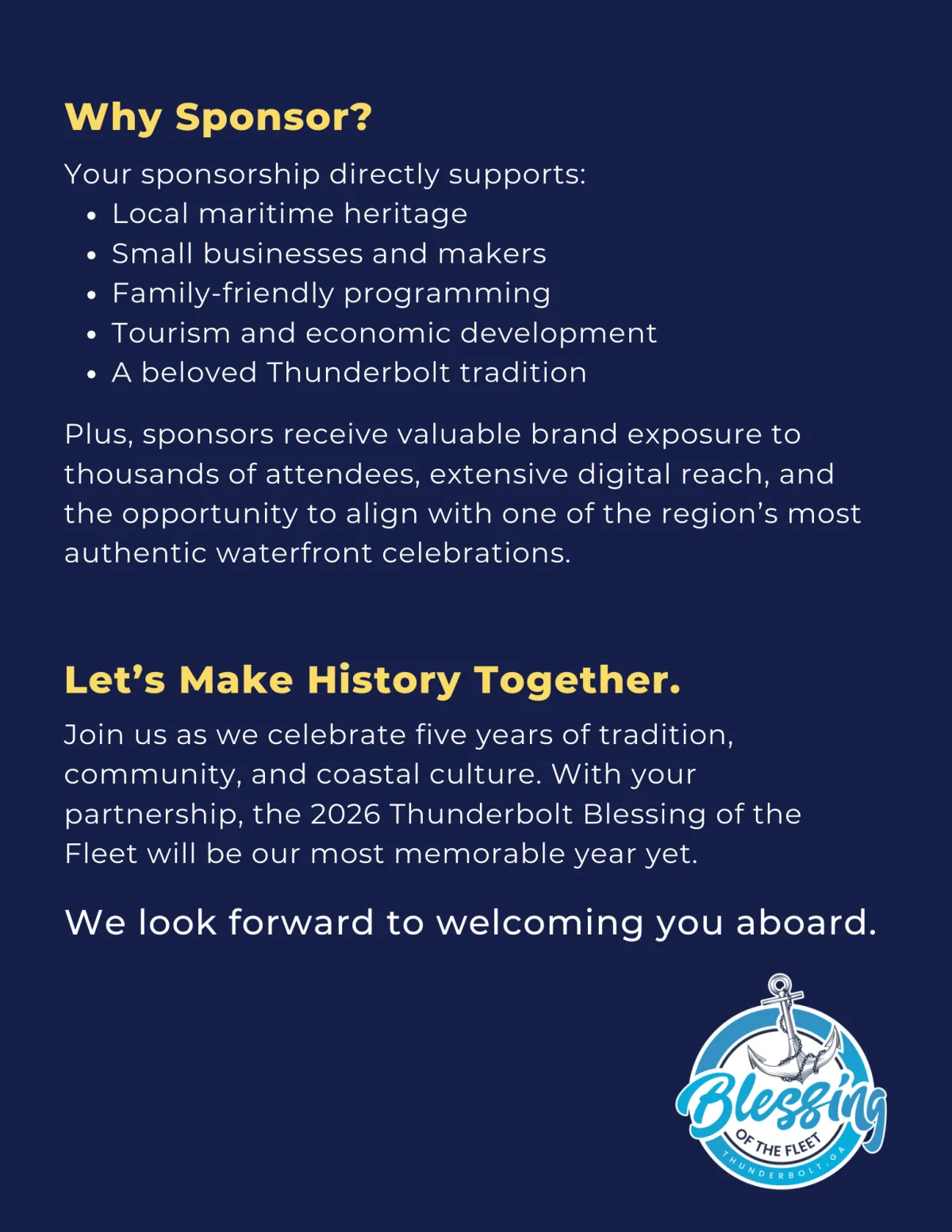 Sponsorship offers a unique opportunity to connect your business with a deeply rooted community event that blends heritage, hospitality, and high visibility. By coming aboard as a sponsor, you’re not only supporting a meaningful local tradition, you’re helping shape an unforgettable experience for residents and visitors alike during Thunderbolt’s most anticipated day of the year.
